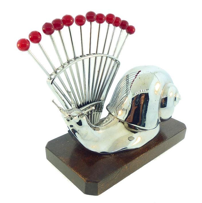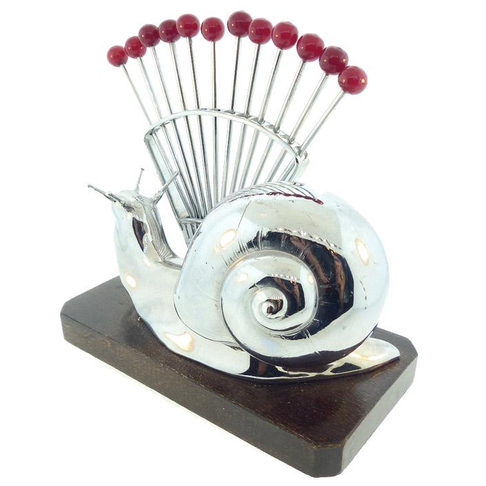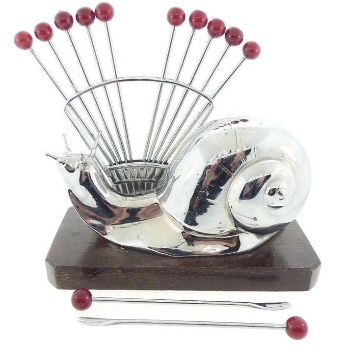 A French Art Deco cocktail pick set in the form a large chrome snail on a mahogany base. The design is by famed French Art Deco illustrator Benjamin Rabier, who enjoyed a lucrative side job designing entertaining barware. The twelve picks have red bakelite finials that resemble cherries. Cocktail pick holders (“porte-piques”) were once a fixture of every Parisian bar and café. Today, they can be used at home to spear olives, cherries, or onions for a cocktail or to serve small hors d’oeuvres.