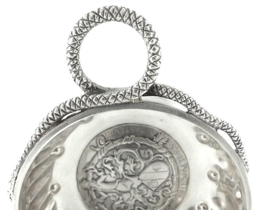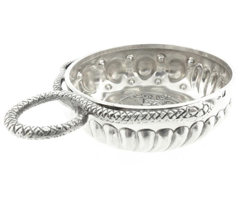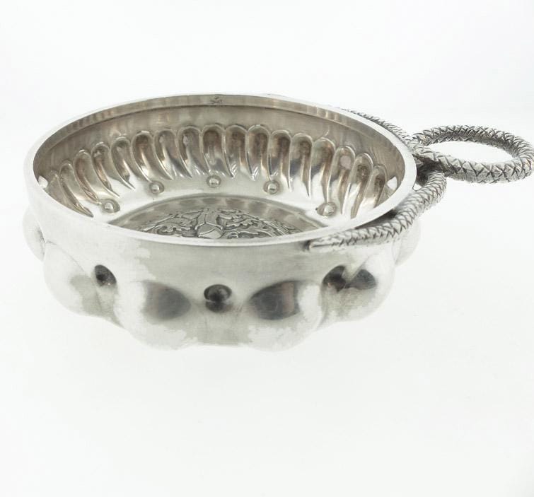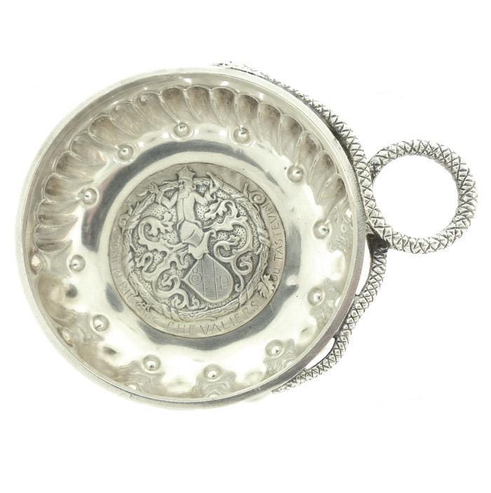 A very rare French first standard silver (950/1000 pure silver) tastevin, the bottom bearing the coat of arms of the Confrerie des Chevaliers du Tastevin. The arms depict St. Vincent, patron saint of winemakers. The body is further decorated with the traditional raised “perles” for highlighting the reflections in the wine and recessed “cupules” and elongated “godrons” intended to concentrate the color during the tasting process. The handle is worked in the snake motif traditional in Burgundian tastevins. The rim is stamped with the master silversmith’s mark for Emile Mémery & Henri Hours.