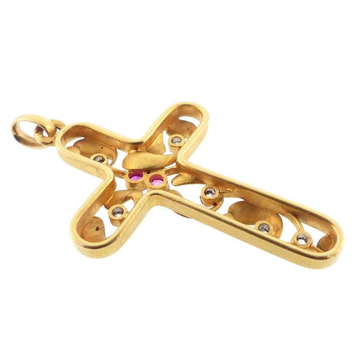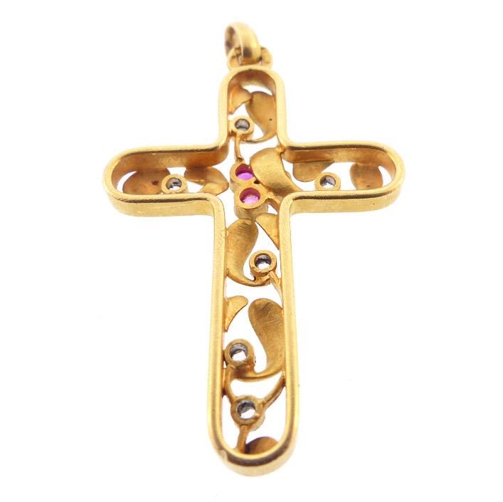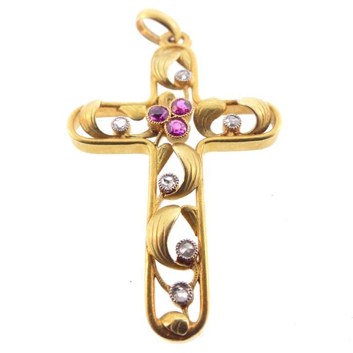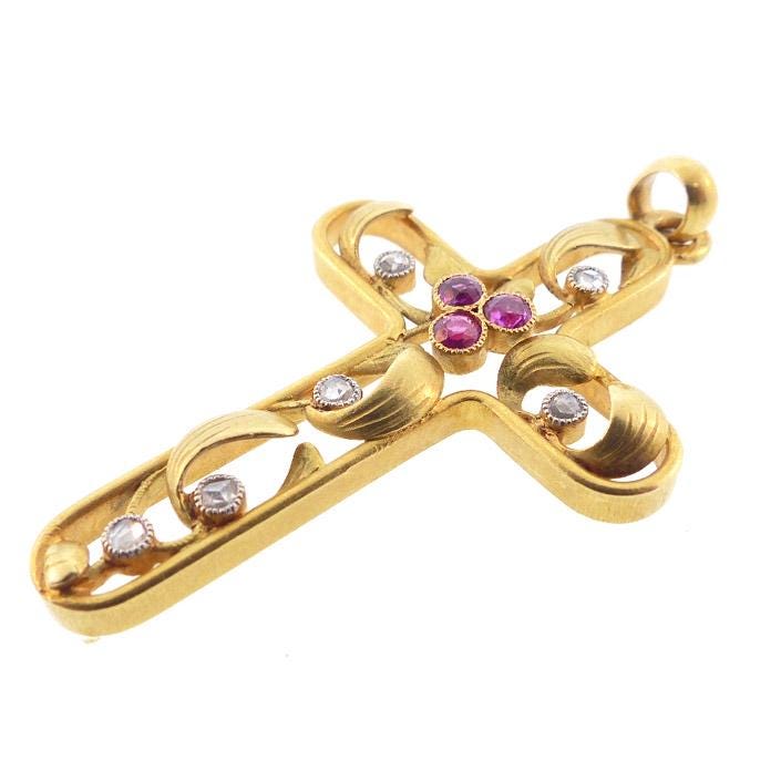 An elegant cross pendant worked in a motif of flowing foliage scattered with rose cut diamonds set in platinum collets. The center of the cross is set with three natural rubies of fine color and no evidence of heat treatment. The gold surfaces have a soft bloomed texture often seen in Art Nouveau jewels. The cross is stamped with both Romanian (royal period) and French 18K and platinum marks.