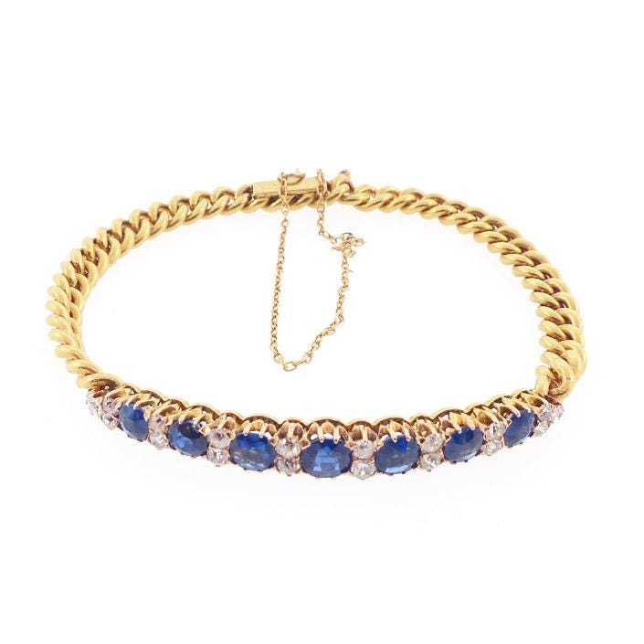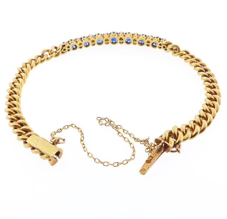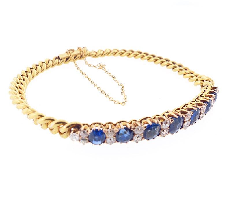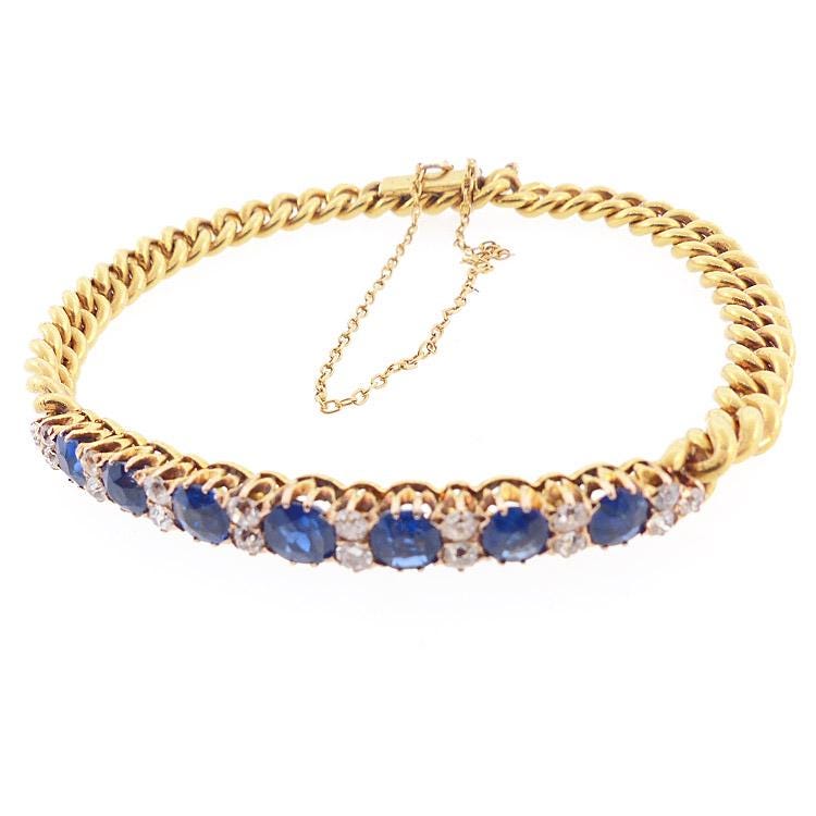 An elegant Edwardian bracelet worked in 14K yellow gold. The bracelet is a combination half-bangle and curb link chain. This unusual combination makes the bracelet more versatile and less overpowering. The bangle portion is set with a row of seven intensely saturated blue sapphires alternating with pairs of old mine cut diamonds. The diamonds are graded as H color, VVS2 clarity. The bracelet is stamped with Romanian (royal period) 14K hallmarks and also with French import marks.