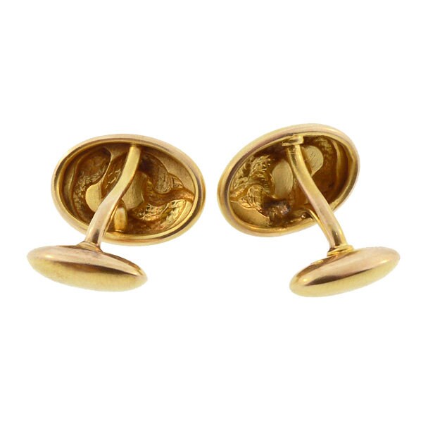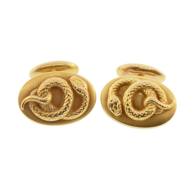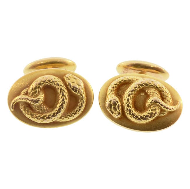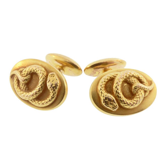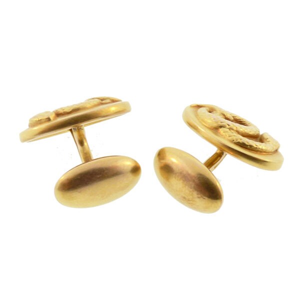A fine pair of late Victorian 14K yellow gold bean-back cufflinks, the front faces decorated with ornately fashioned coiled snakes. The gold surface is treated to the soft, semi-matte bloomed finish sometimes seen in Victorian and Art Nouveau jewels. Kirby seemed particularly partial to snakes and produced several different serpent designs for cufflinks. In Victorian symbology, snakes conveyed sentiments of eternal love. Each cufflink is stamped “14K” and bears the maker’s mark for H. A. Kirby & Co.