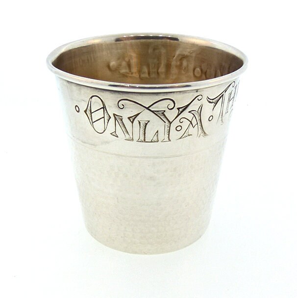 A vintage sterling silver figural jigger in the shape of a thimble. The rim is engraved "Only A Thimble Full." The interior is gilt. The bottom is hallmarked by the Webster Silver Co.